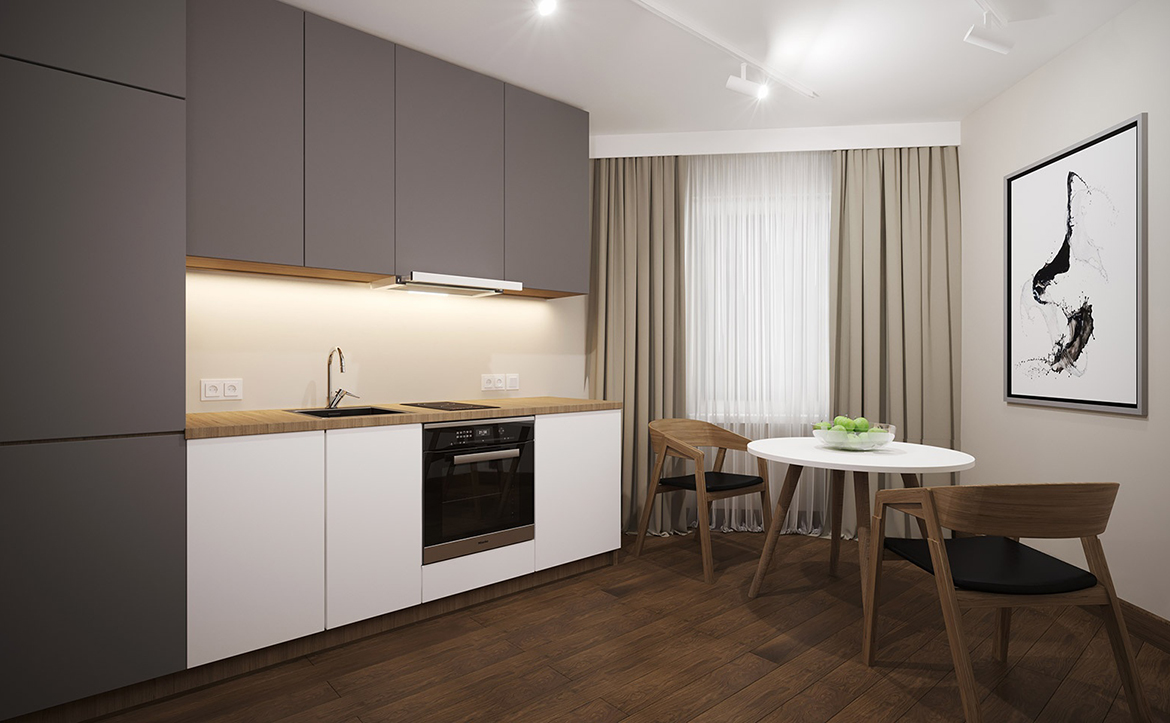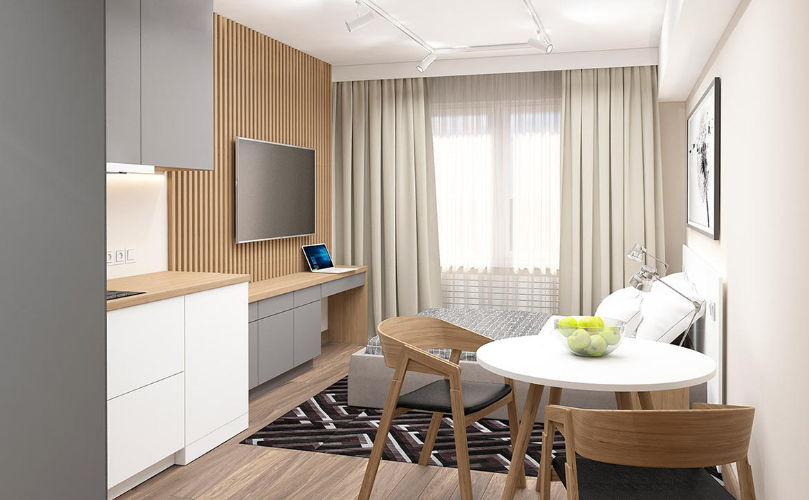 Полная отделка позволит получать доход сразу после сдачи дома и сэкономить на ремонте. Отделка выполняется в нейтральных тонах. За дополнительную плату застройщик готов помочь собственникам в покупке мебели.