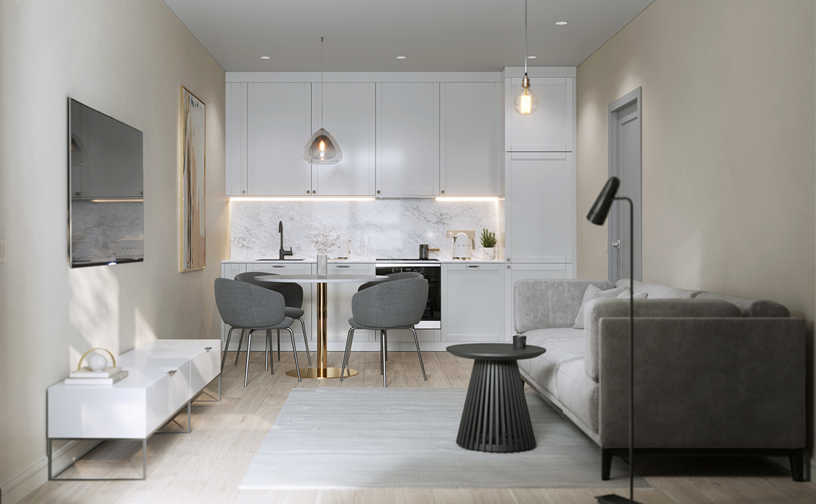 Дизайн отделки квартир создавался совместно со студией архитектуры и дизайна Sredaa. В санузлах устанавливается сантехника премиум класса, душевая или ванна, раковина с тумбой и смесителем. Стены и полы в санузле выложены керамогранитом. В комнатах и кухнях будет установлен ламинат, межкомнатные двери и обои под покраску. Производится скрытая разводка кабельных линий, установка выключателей и розеток.