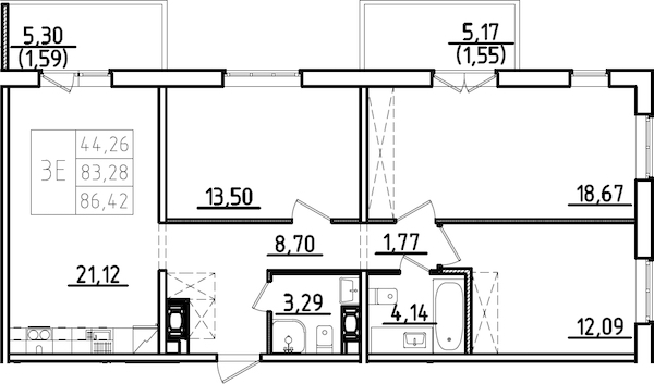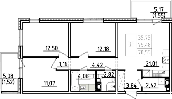 1-комнатная квартира 51.84 м², 6/9 эт.