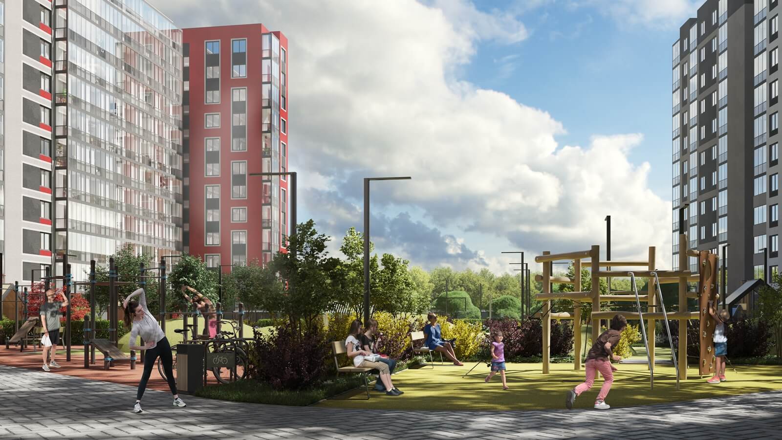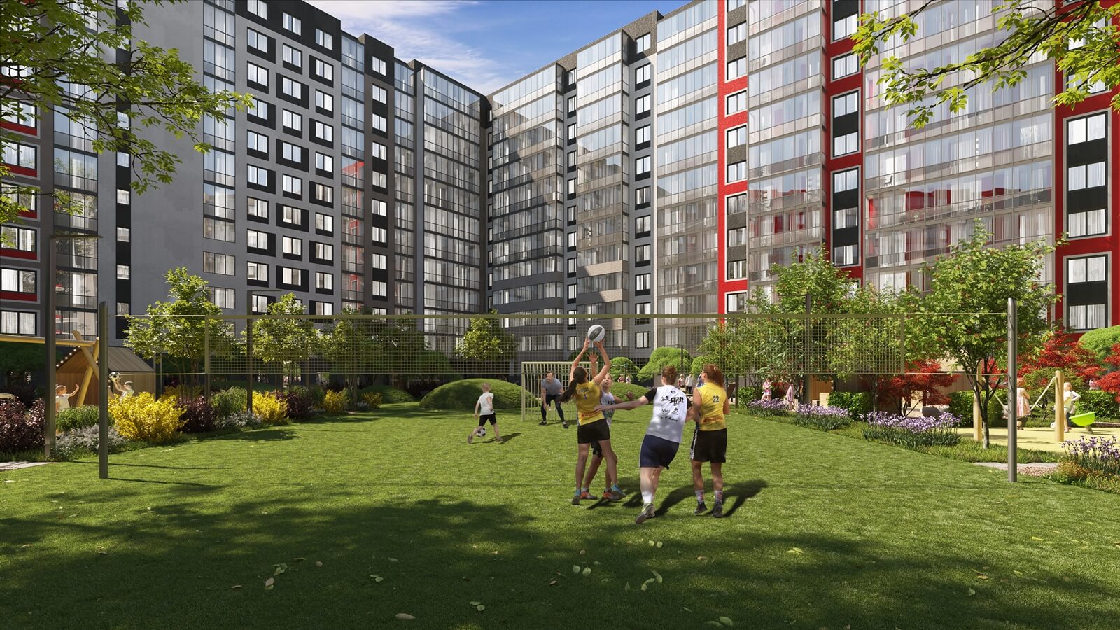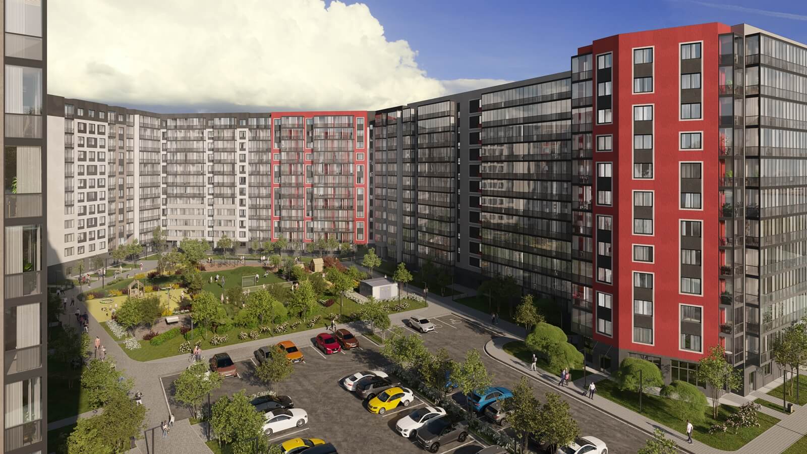 ЦДС «Новые Горизонты» состоит из 5 жилых домов (по 15 этажей каждый) и крытого паркинга, объединённых общим архитектурным и цветовым решением. Просторный двор, по размеру сравнимый с 10 футбольными полями, включает в себя всё необходимое для комфортного пребывания на свежем воздухе: оригинальные игровые площадки для детей разных возрастных групп, зоны для занятий спортом, прогулок и спокойного отдыха. В «Новых Горизонтах» вы обязательно найдете свое место силы. В нашем проекте мы создали пространство для жизни, отдыха и общения, в котором вы будете чувствовать себя комфортно и свободно. Проводите время со своей семьей в нашем просторном и светлом дворе, где каждый сможет найти занятие по душе.